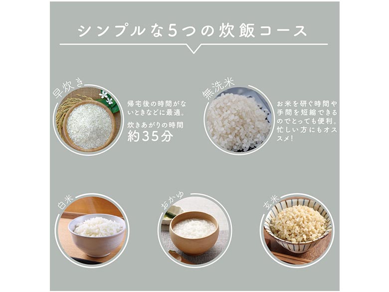 | その他詳細 1 | 定格 AC100V 50/60Hz 消費電力 500W コード長さ 約110㎝ 最大炊飯量(白米) 約0.8L(5合) タイプ マイコン式 メニュー 白米、早炊き、無洗米、玄米、おかゆ 予約 1時間30分~24時間(30分刻み) 保温 12時間 |