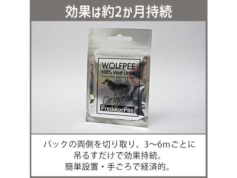 雨水が袋の中に入らないように設置して下さい。ウルフピーの匂いで動物が寄り付かなくなります。
