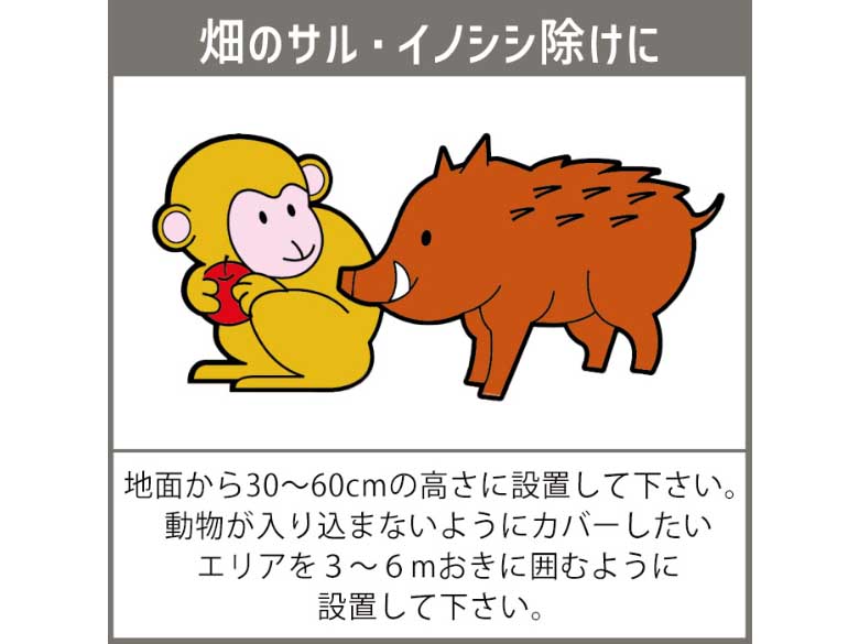 地面から30~60cmの高さに設置して下さい。動物が入り込まないようにカバーしたいエリアを3~6mおきに囲むように設置して下さい。