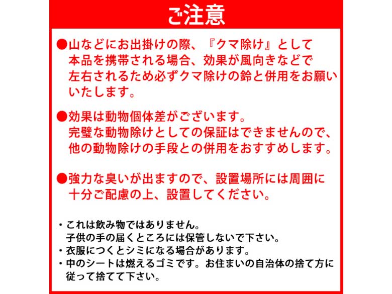 ※飲み物ではありません。子供の手の届くところには保管しないで下さい。誤飲した場合は直ちに専門の医師に相談して下さい。 ※衣服につくとシミになる場合があります。 ※高温になる場所、長時間直射日光の当たる場所には置かないで下さい。 ※フルフピーは天敵を嫌がる動物の習性を利用して、対象となる動物を近づけにくくするものです。自然の動物の本能を利用した商品ですので、効果は動物個体差がございます。完璧な動物除けとしての保証はできませんので、他の動物除けの手段との併用をおすすめいたします。 ※中のシートは燃えるゴミです。お住まいの自治体の捨て方に従って捨てて下さい |