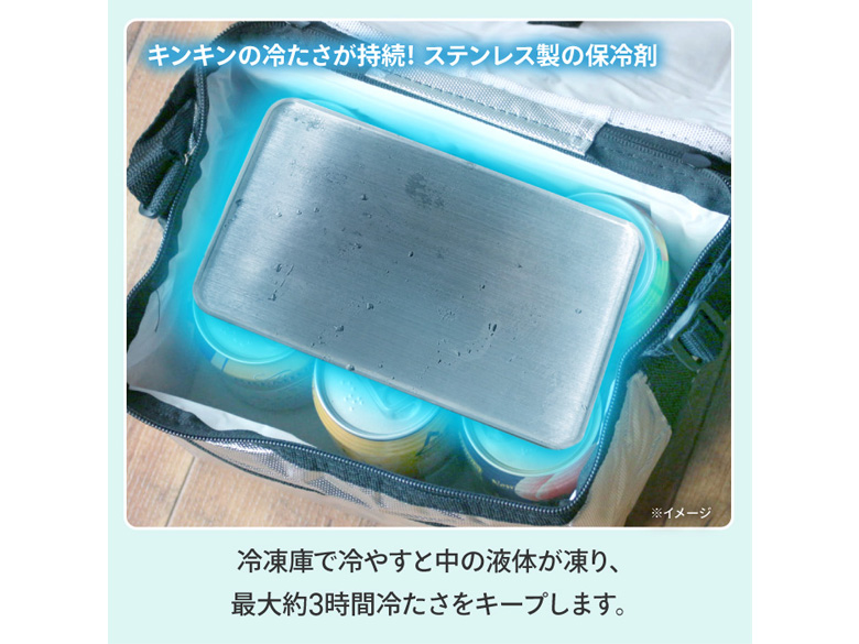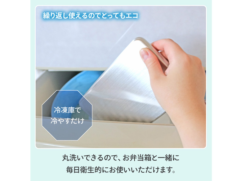 冷凍庫で冷やすと中の液体が凍り、最大約3時間冷たさをキープします。