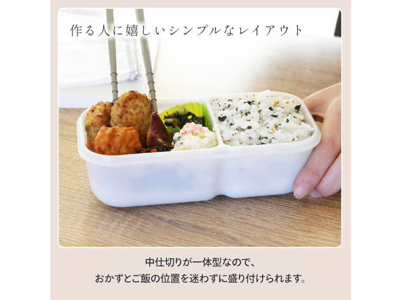 中仕切りが一体型なので、おかずとご飯の位置を迷わずに盛り付けられます。シンプルなレイアウトで、毎日の盛り付けが簡単にできるのは嬉しいポイントです。