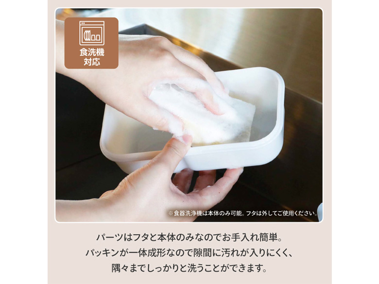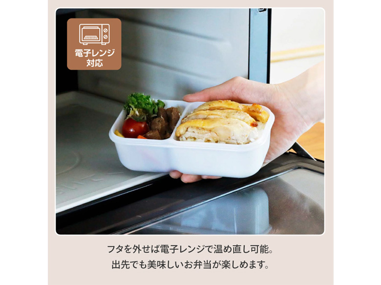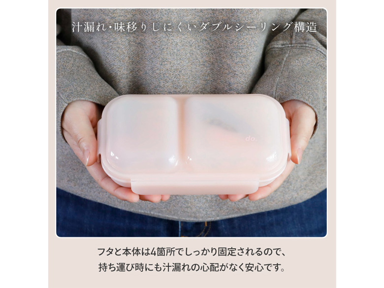 ドーム蓋はパッキン一体成形で、本体も中仕切りが一体型。おかずスペースとご飯スペースが独立して密閉され、汁漏れや味移りを防ぎます。