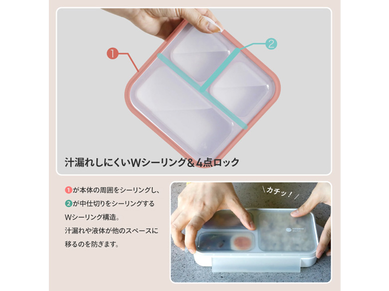 ●汁漏れしにくいWシーリング&4点ロック