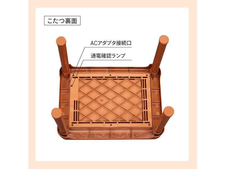 | その他詳細 1 | ●安全装置:温度ヒューズ75℃ / 温度ヒューズ110℃ ●参考温度:約 30℃(こたつ内中央空間温度) ●ACアダプタ: 入力:100-240V 50/60Hz 0.7A 出力:12V 2A ●セット内容:こたつ、ACアダプタ、ふとん、保証書兼取扱説明書 |