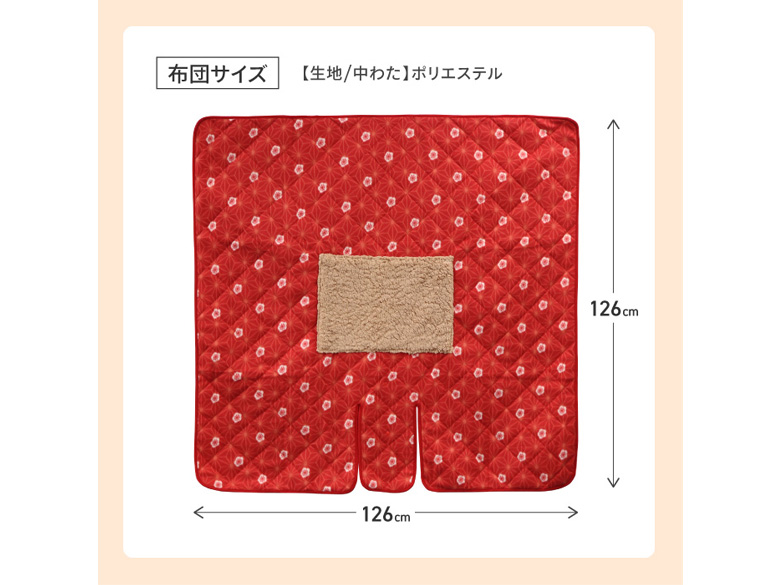 | サイズ/寸法 | ●こたつ:約 縦33×横45×高さ30cm ●ふとん:約 126×126cm ●コード長:約 210cm |