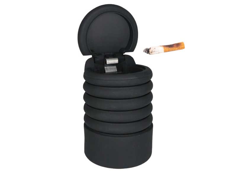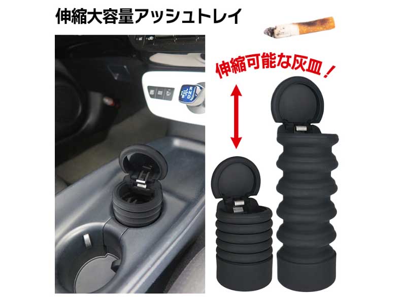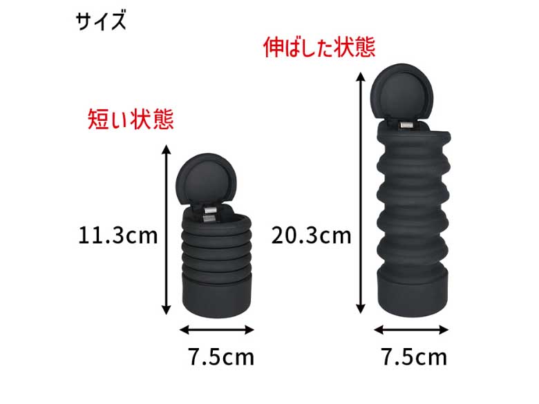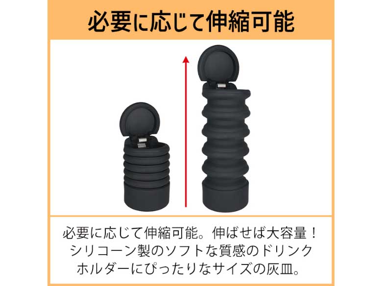 必要に応じて伸縮可能。伸ばせば大容量!シリコーン製のソフトな質感のドリンクホルダーにぴったりなサイズの灰皿!
