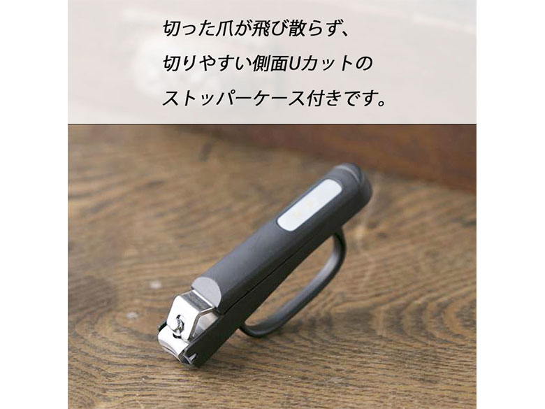 切った爪が飛び散らず、切りやすい側面Uカットのストッパーケース付きです。