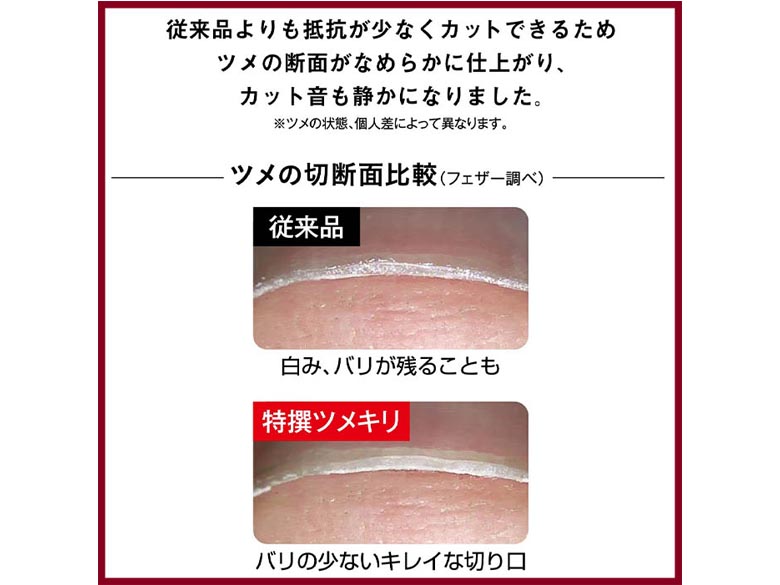 ・従来品よりも抵抗が少なくカットできるため、ツメの断面がなめらかに仕上がり、
