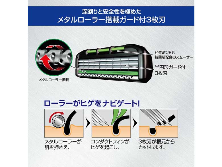 ・メタルローラー搭載ガード付3枚刃で安全に深剃り!