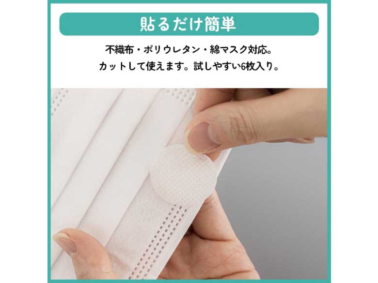 | 注意事項/留意事項 | ※鼻・口に近い位置は避けて貼り付けてください。 ※マスクの生地によってはシール糊が残る場合があります。 ※疾患をお持ちの方はご使用前に専門医にご相談ください。 ※ウレタンマスクからはがす場合、生地が破れないようゆっくりはがしてください。 ※製品の仕様は予告なく変更する場合があります。予めご了承ください。 ※画像はイメージです。実際の商品とは多少異なる場合があります。 ※開封後の返品は承っておりません。 |