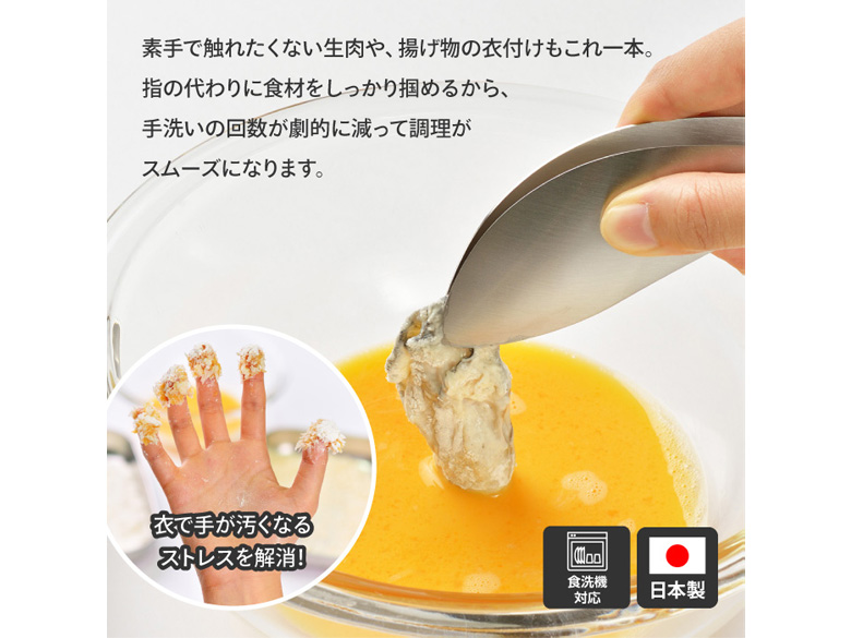 素手で触れたくない生肉や、揚げ物の衣付けもこれ一本。