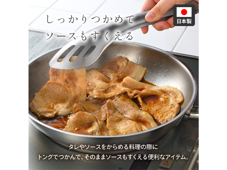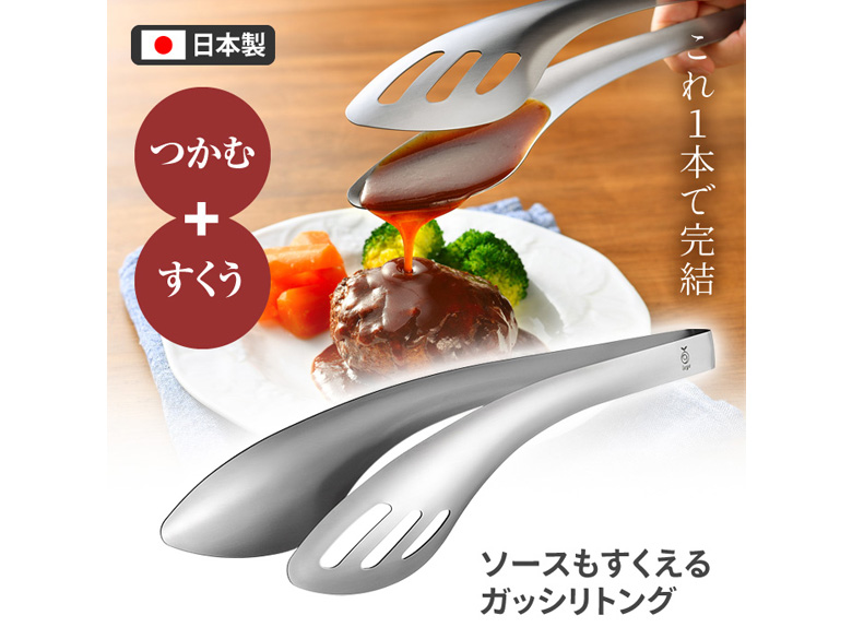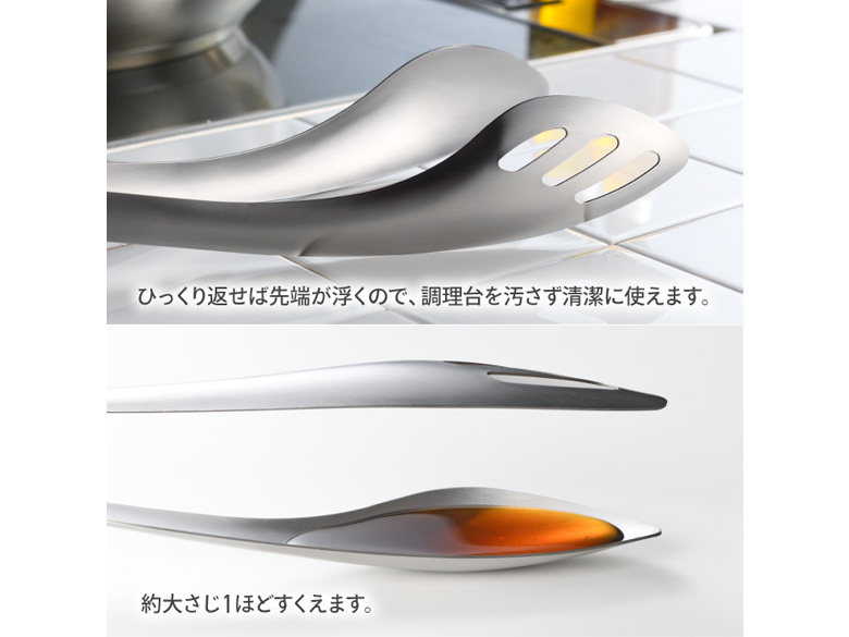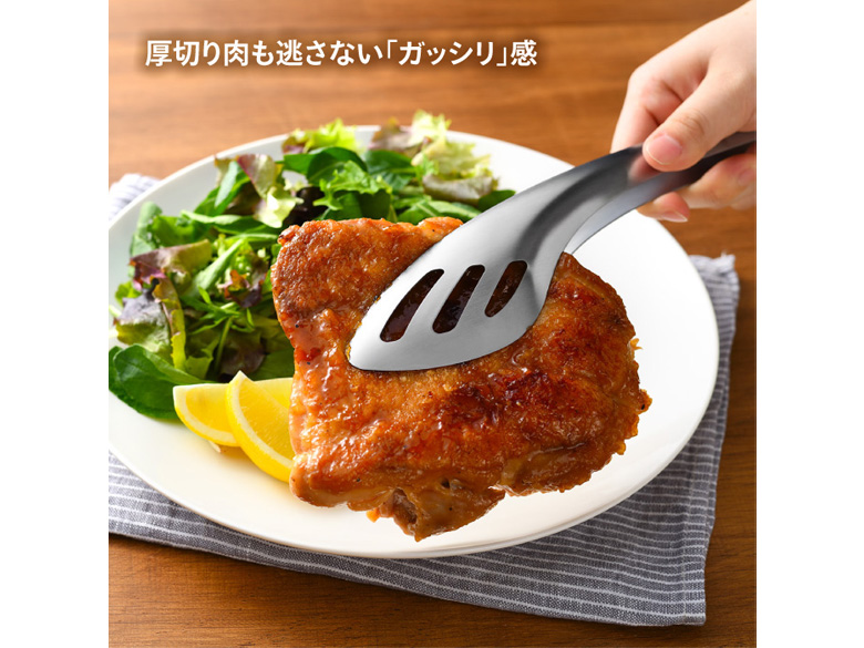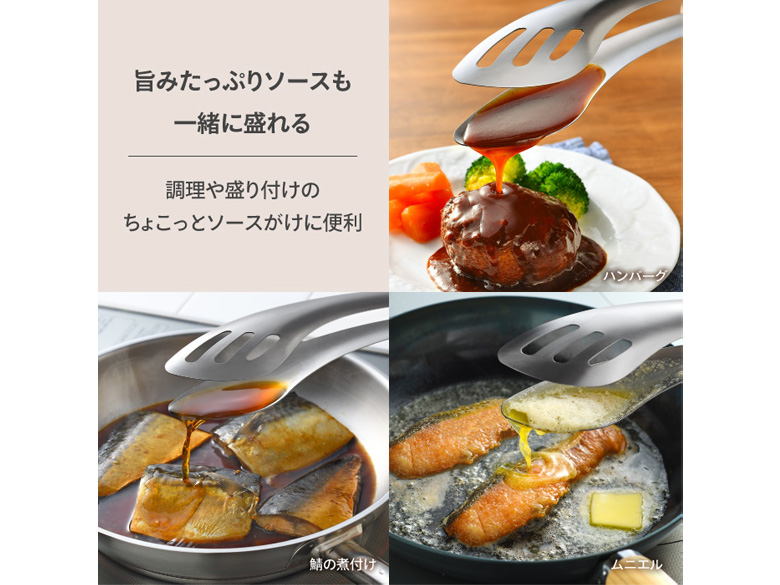 大きなステーキやハンバーグをガッシリ掴んで裏返し。さらにスプーン状の先端で、フライパンに残った美味しいソースも残さず一緒に盛り付けられます。