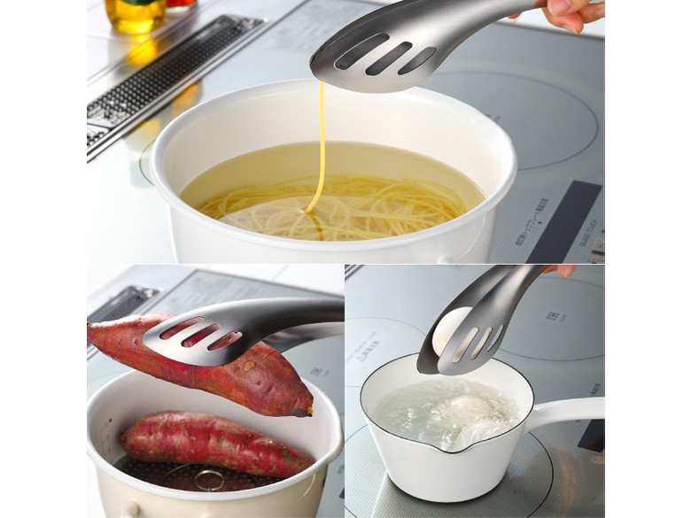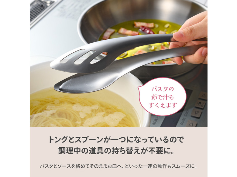 トングとスプーンが一つになったから、調理中の道具の持ち替えが不要に。パスタとソースを絡めてそのままお皿へ、といった一連の動作も驚くほどスムーズです。