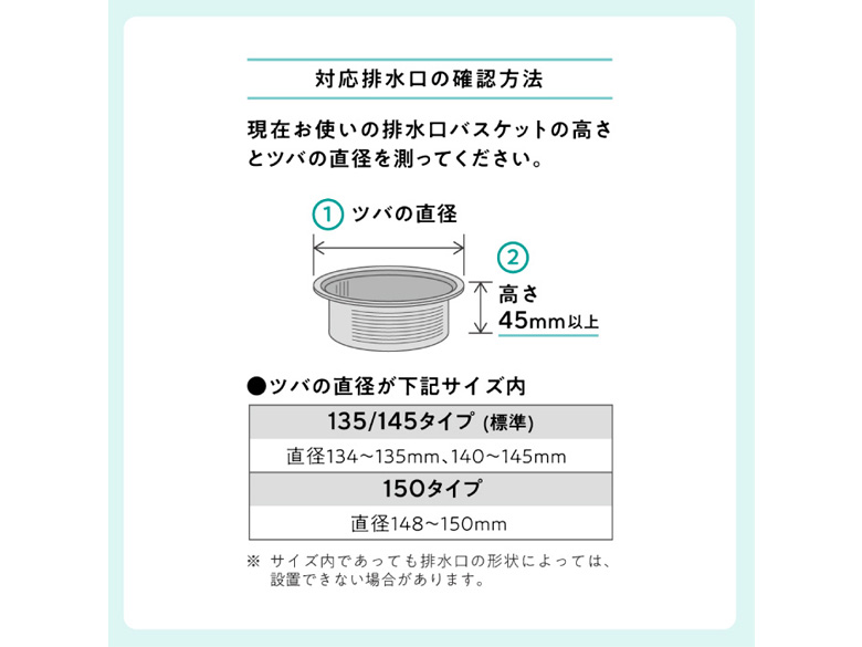 | 注意事項/留意事項 | ※本製品は市販の排水口用水切りネットをセットするためのホルダーです。 ※水切りネットは付属していません。 ※現在お使いの排水口バスケットは取り外してご使用ください。 ※お使いのモニターにより、実際の色と異なる場合があります。 ※製品の仕様は予告なく変更する場合があります。予めご了承ください。 ※画像はイメージです。実際の商品とは多少異なる場合があります。 ※開封後の返品は承っておりません。 |