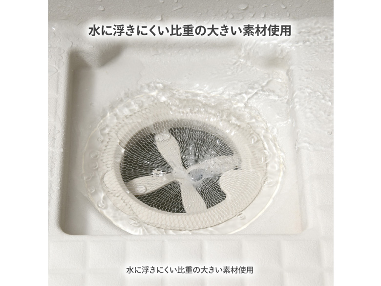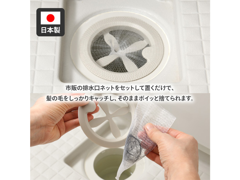 市販の排水口ネットをセットして置くだけで、髪の毛をしっかりキャッチし、