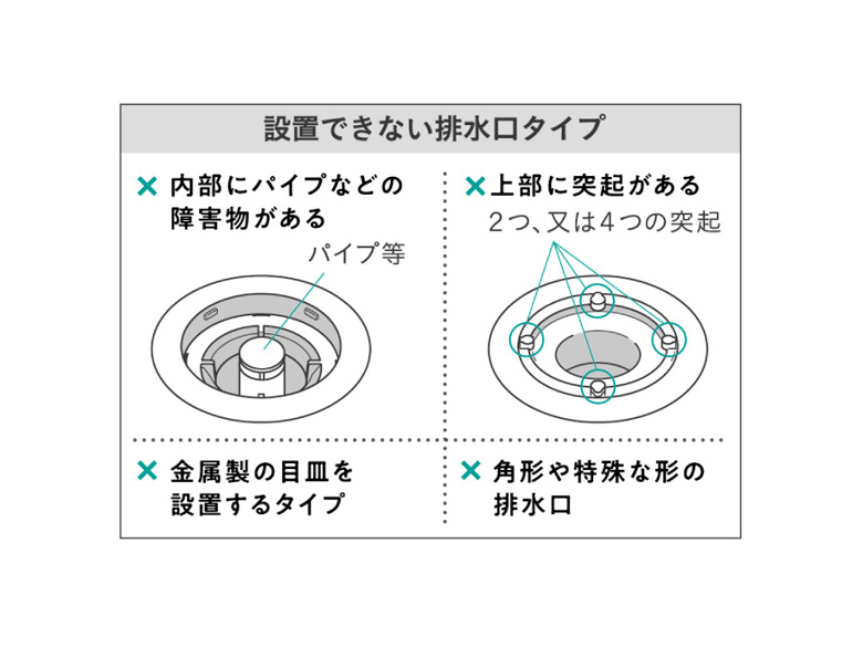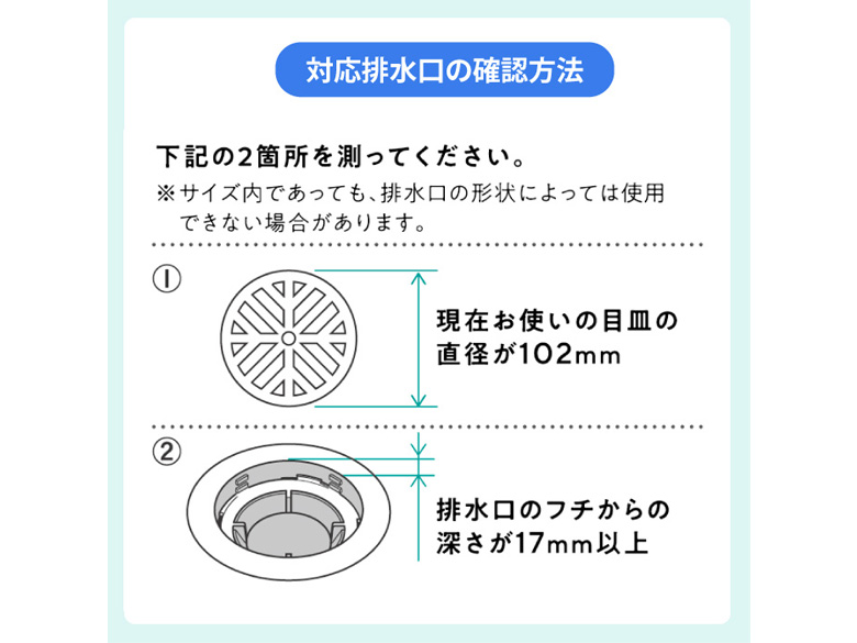 | 注意事項/留意事項 | ※本製品は市販の排水口ネットをセットするためのホルダーです。 ※排水口ネットは付属していません。 ※現在お使いの排水口の目皿は取り外してご使用ください。 ※お使いのモニターにより、実際の色と異なる場合があります。 ※製品の仕様は予告なく変更する場合があります。予めご了承ください。 ※画像はイメージです。実際の商品とは多少異なる場合があります。 ※開封後の返品は承っておりません。 |