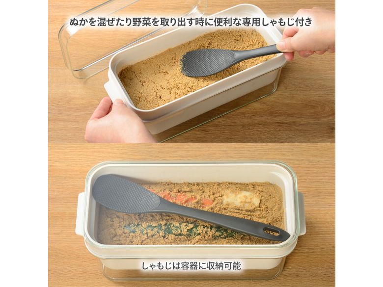 ぬかを混ぜたり野菜を取り出す時に便利な専用しゃもじ付き。