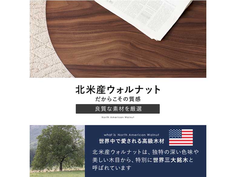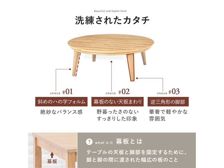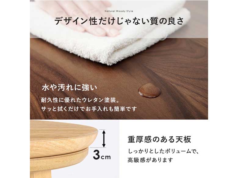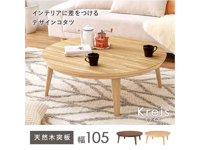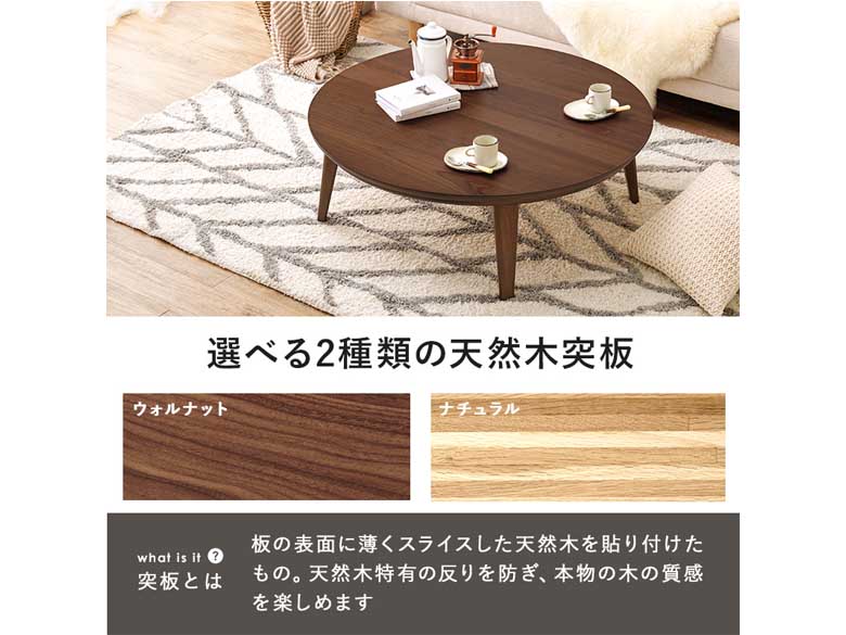 表情豊かな天然木突板を使用した洗練されたデザインの円形こたつです。