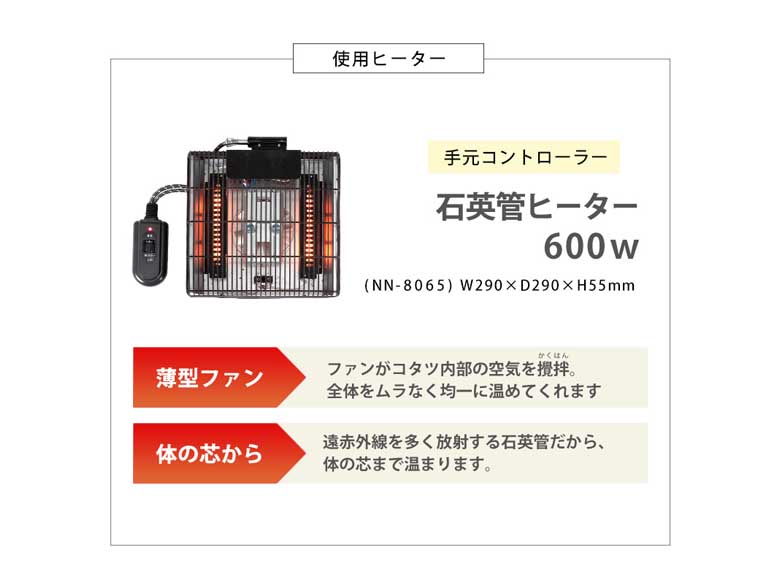 | 原材料/素材/材質 | 天板:天然木化粧繊維板(オーク突板,ウォールナット突板)・UV塗装、脚部:ラバーウッド、ヒーター:NN-8065 600W石英管ヒーター(手元コントローラー付) |