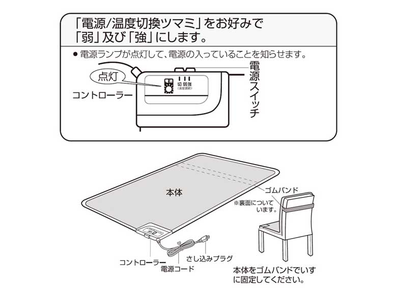 | その他詳細 2 | 温度調節(弱) 電気代(1時間あたり)約0.9円、消費電力量(1時間あたり)約33Wh、表面温度約42度 温度調節(強) 電気代(1時間あたり)約1.1円、消費電力量(1時間あたり)約41Wh、表面温度約52度 |
