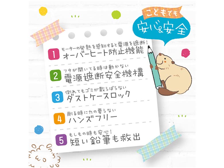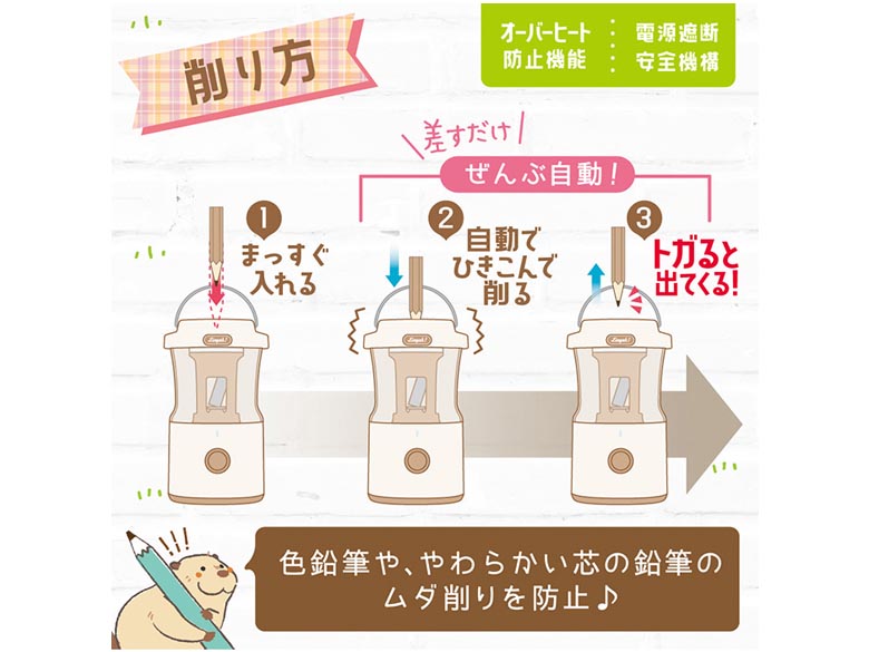| リビガク 充電式トガリターン 芯先調整付 トガると出てくる全自動鉛筆削り ・全自動で鉛筆がトガると出てくる!こどもでも安心&安全えんぴつ削り♪ ・鉛筆を差すだけで自動で引き込み→削り上がると自動で排出!力の要らないハンズフリー。 ・モーターの熱を感知すると電源を遮断!オーバーヒート防止機能。 ・フタが開いている時は動かない。電源遮断安全機構。 ・倒れてもゴミが散らばらない。ダストケースロック機構。 ・短い鉛筆が詰まっちゃった!そんな時も中身が救出しやすい設計。 ・六角・三角・丸型の鉛筆に対応。 ・かわいいランタン型で、お部屋のインテリアにも馴染むデザイン。 充電時間 約90分(USB充電) 削れる回数 満充電:約600回 サイズ 96×165×99(mm) 材質 ABS メーカー ソニック ※製品の仕様は予告なく変更する場合があります。予めご了承ください。 ※画像はイメージです。実際の商品とは多少異なる場合があります。 |