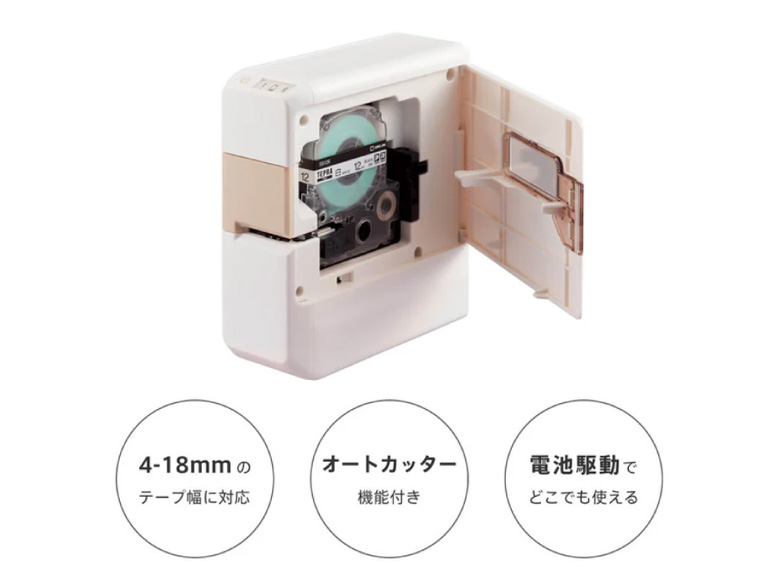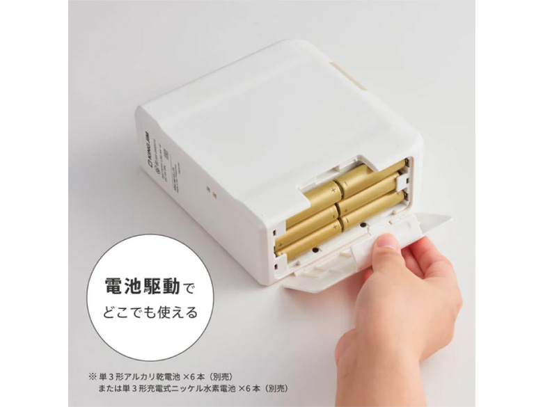 本体は、単3形アルカリ乾電池×6本(別売)または単3形充電式ニッケル水素電池×6本(別売)で駆動するため、場所を選ばずにどこでもラベルを作ることができます。