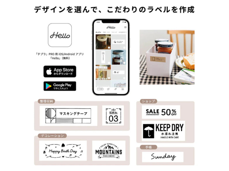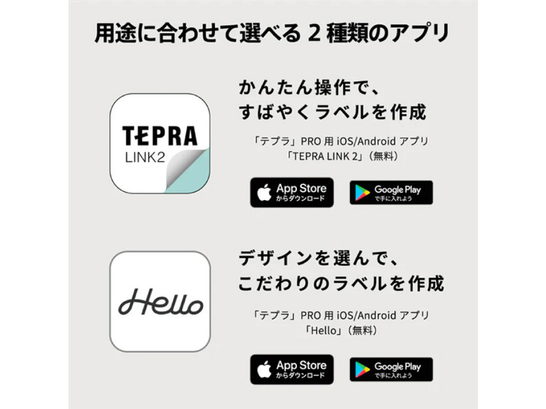 2つの「テプラ」PRO用アプリ「Hello」「TEPRA LINK 2」とBluetooth®で接続して、お手持ちのスマホから簡単にラベルを作ることができます。