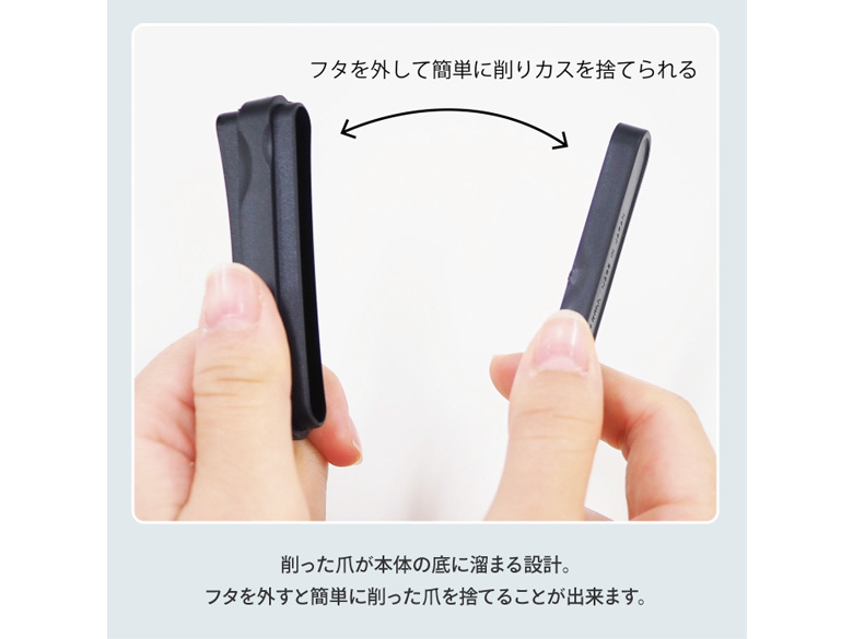 削った爪が本体の底に溜まる設計。フタを外すと簡単に削った爪を捨てることが出来ます。