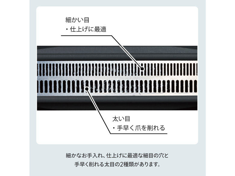 細かなお手入れ、仕上げに最適な細目の穴と手早く削れる太目の2種類があります。
