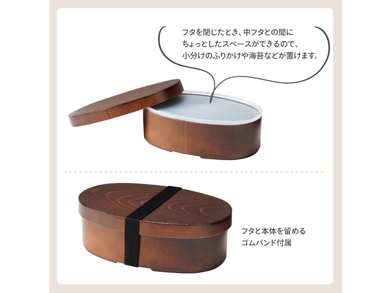 | 原材料/素材/材質 | 本体・上フタ PET、ABS樹脂(山中塗り加工)(耐熱温度140度、耐冷温度-30度) 中フタ ポリエチレン(耐熱温度80度、耐冷温度-20度) ゴムバンド 天然ゴム、ポリエステル |