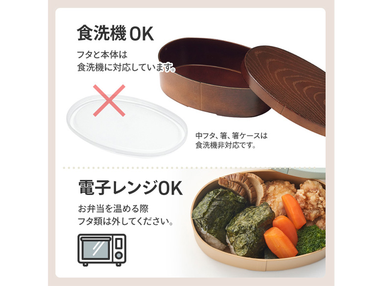 | 注意事項/留意事項 | ※製品の仕様は予告なく変更する場合があります。予めご了承ください。 ※画像はイメージです。実際の商品とは多少異なる場合があります。 ※本製品は弁当箱です。本来の用途以外にはご使用にならないでください。 ※本製品は密封容器ではありません。汁気のある 食品の場合は特に持ち運びの際にこぼれないようにご注意ください。電子レンジによる加熱時には、中フタを外してご使用ください。複合型電子レンジでは、オーブン、グリル機能でのご使用はできません。 ※油の多い食品の加熱はお避けください。 ※電子レンジ及び食洗機の取扱説明書もよくお読みください。 ※使用後は、食器用洗剤をやわらかいスポンジなどに付けてよく洗ってください。たわし、または、みがき粉でみがくとキズがつきますのでご使用にならないでください。漂白剤や塩素系洗剤などもご使用にならないでください。 |