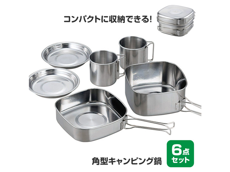 角型鍋・角型フライパン・皿×2・マグ×2のペアで使えるキャンピング鍋6点セット。