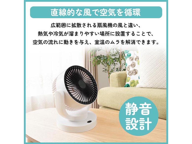 広範囲に拡散される扇風機の風と違い、熱気や冷気が溜まりやすい場所に設置することで、空気の流れに動きを与え、室温のムラを解消できます。