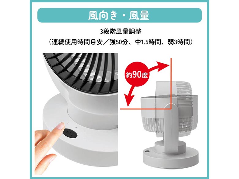 | その他詳細 1 | 3段階風量調整(連続使用時間目安/強50分、中1.5時間、弱3時間) |