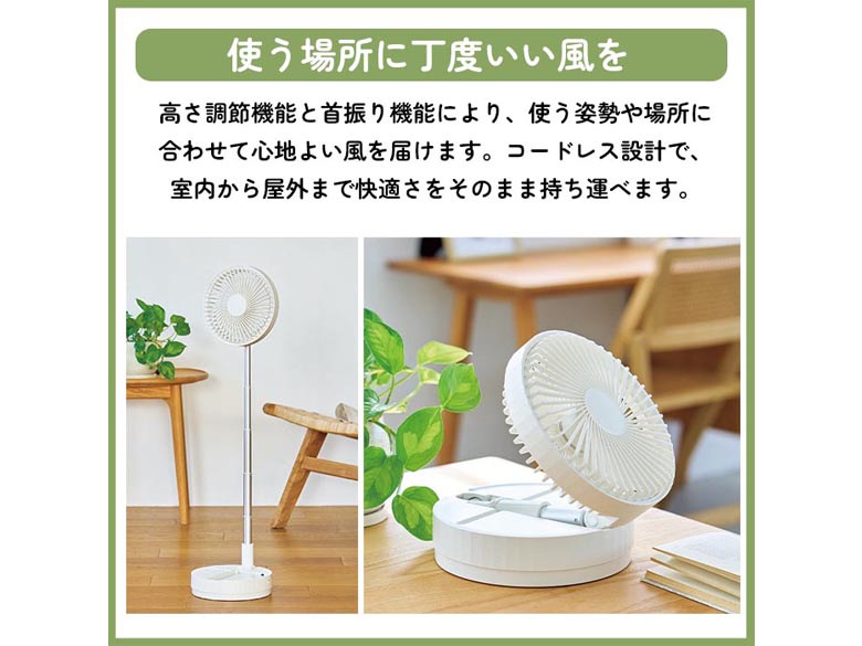 高さ調節機能と首振り機能により、使う姿勢や場所に合わせて心地よい風を届けます。