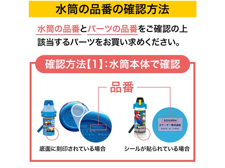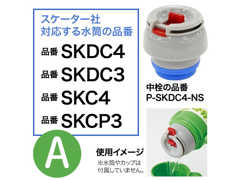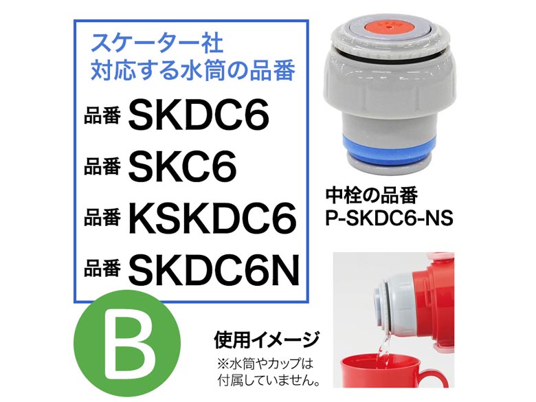 | その他詳細 1 | 【B】P-SKDC6-NSが対応する水筒の品番 ・メーカー スケーター ・品番:SKDC6、SKC6、KSKDC6、SKDC6N ※品番の確認方法は掲載中の画像:「水筒の品番の確認方法」をご参照ください。 |