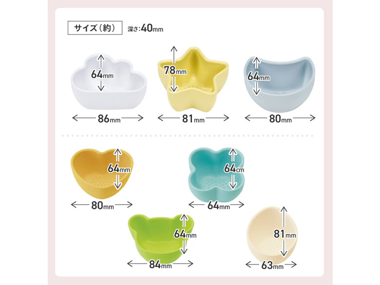 | サイズ/寸法 | くも型:86×64×40mm(100ml) ほし型:81×78×40mm(90ml) つき型:80×64×40mm(100ml) |
