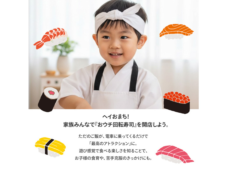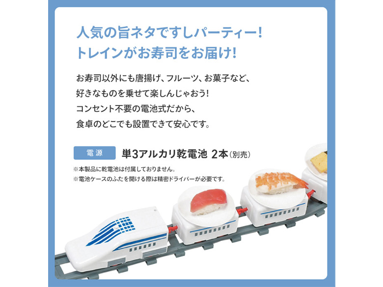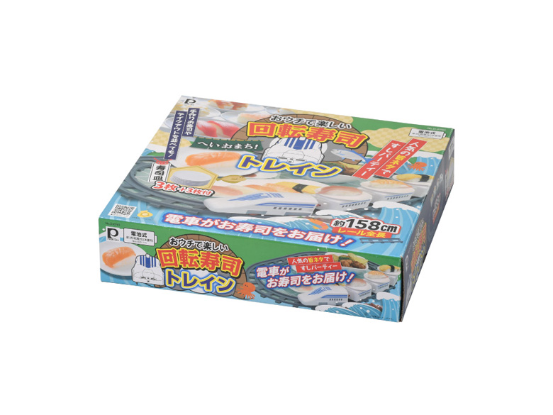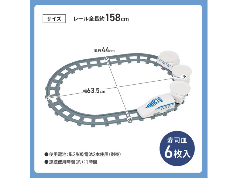 | 内容量 | 先頭車両、連結車両、直線レール×2、曲線レール×8、すし皿×6 |