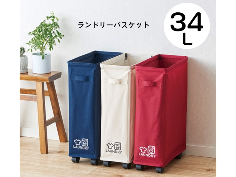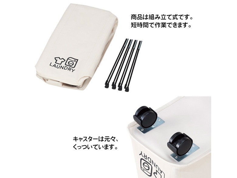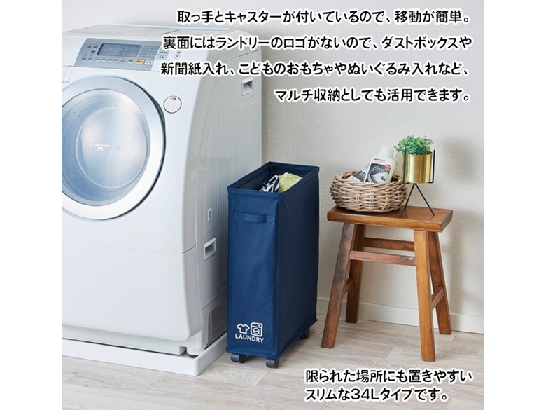 取っ手とキャスターが付いているので移動も簡単。洗濯衣類用だけでなく、新聞紙、おもちゃ、ぬいぐるみ、ごみなどの専用ボックスとしても使えます。