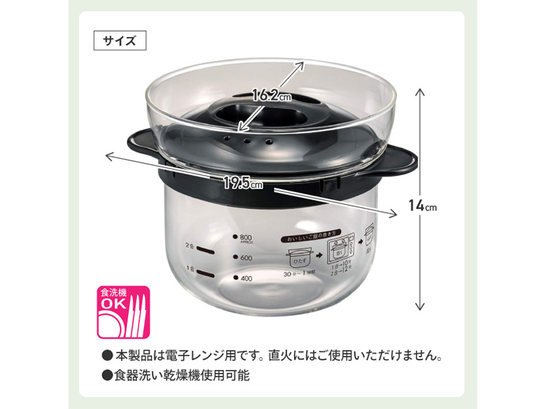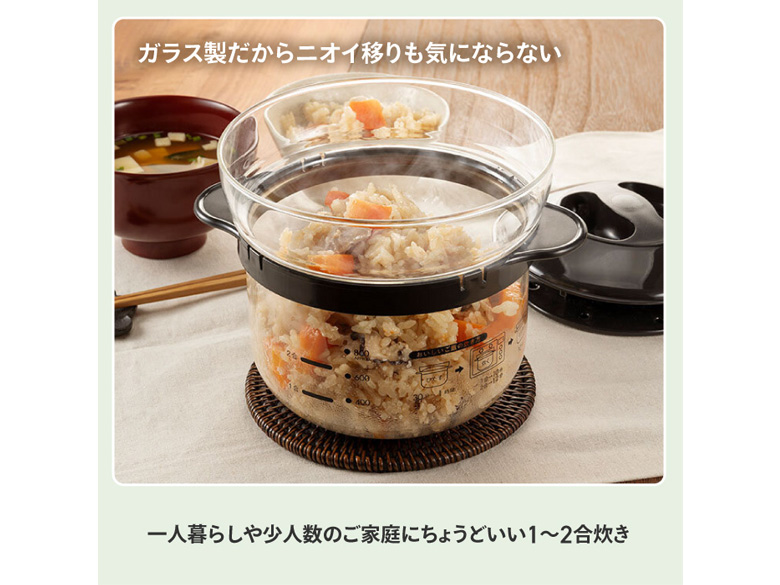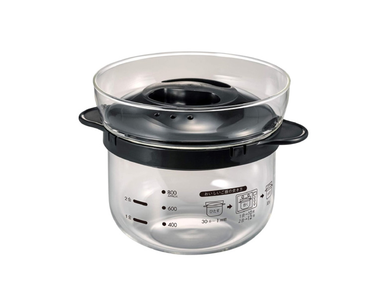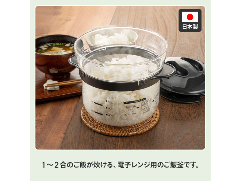 1~2 合のご飯が炊ける、電子レンジ用のご飯釜です。