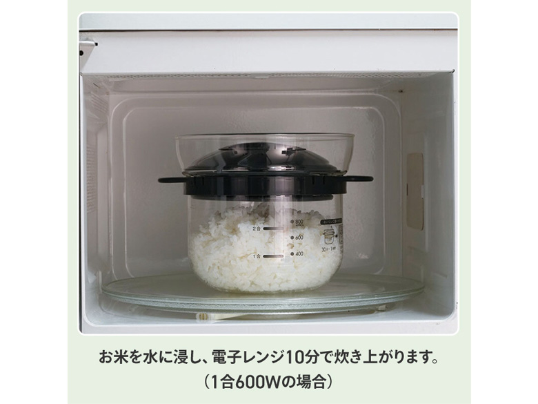 お米を水に浸し、電子レンジ10分で炊き上がります。(1合600Wの場合)