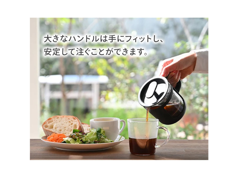 大きなハンドルは手にフィットし、安定して注ぐことができます。