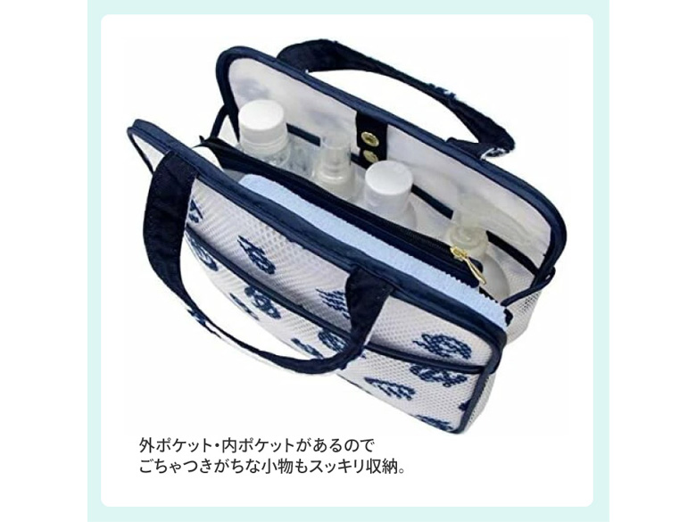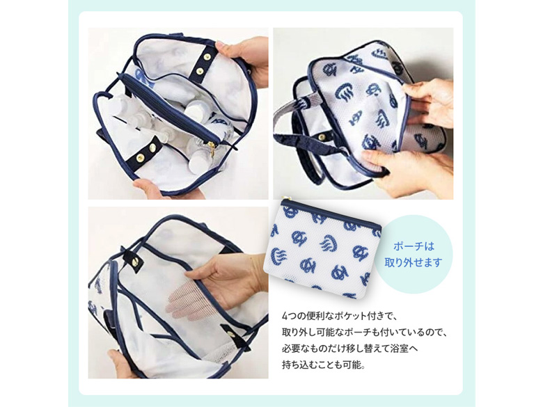 4つの便利なポケット付きで、取り外し可能なポーチも付いているので、必要なものだけ移し替えて浴室へ持ち込むことも可能。