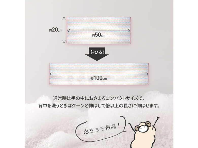 背中を洗いやすい、ぐーんと伸びるストレッチボディタオル。