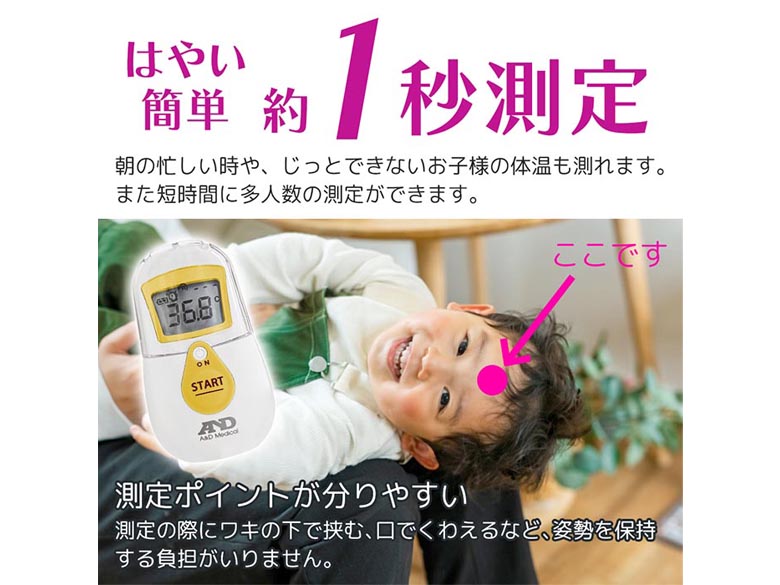 | 肌に触れずに素早く測れる。 約1秒測定だからお子様の体温も簡単! |