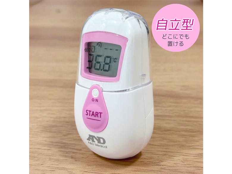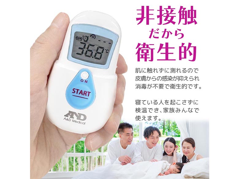 非接触体温計は、肌に触れずに測れるので、皮膚からの感染が抑えられ、消毒が不要で衛生的です。