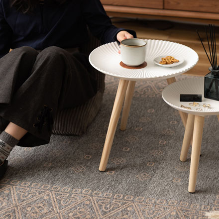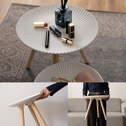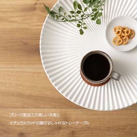 プリーツ風加工の美しい天板とナチュラルウッドの脚がおしゃれなトレーテーブル。ベッドやソファのサイドテーブルに。