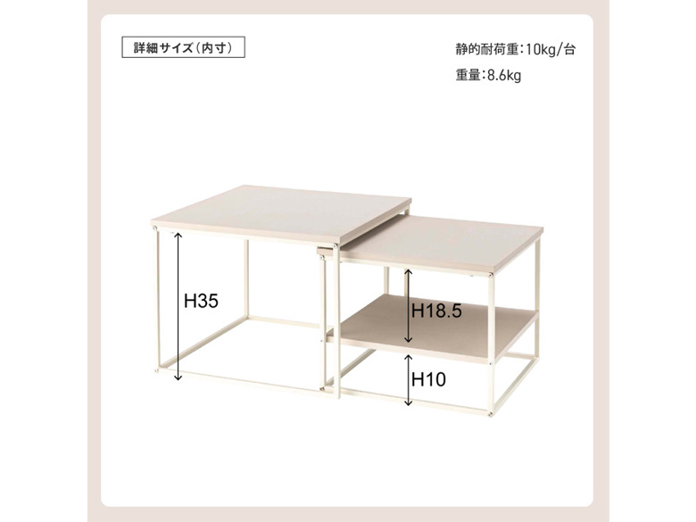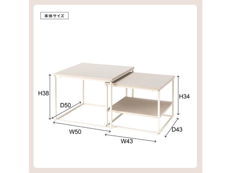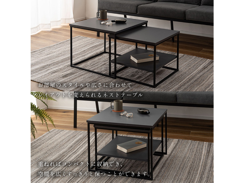 お部屋のスタイルや広さに合わせてレイアウトを変えられるネストテーブルは、2台を並べてゆったりとしたリビングテーブルとして使えるのはもちろん、重ねればコンパクトに収納でき、空間を広くすっきりと保つことができます。