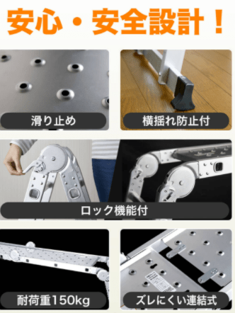 | 内容量 | 本体、天板プレート(大・小)、ステップ、スタビライザー付脚立足2本、ネジ4本、ナット4個、軍手1双、レンチ2個、取扱説明書 |